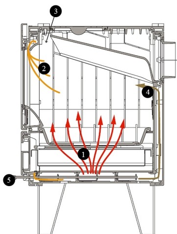 die primärluft 1 strömt direkt in die glutwanne und treibt sanft die entgasung an. die sekundärluft 2 hält die glasscheibe sauber und durchmischt die brenngase mit dem notwendigen sauerstoff vor dem flammkanal 3. mit der tertiärluft 4 werden die im hinteren bereich des feuerraumes austretenden gase zeitnah durchmischt und zur zündreaktion gebracht.